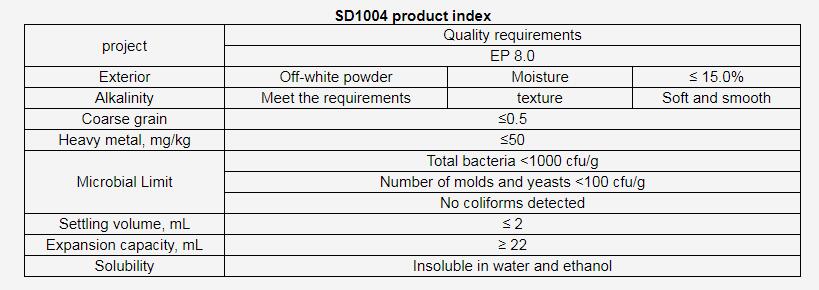 Sd1004 meets the requirements of European Pharmacopoeia EP 8.0, usp40-nf35, British Pharmacopoeia bp2017, Japanese Pharmacopoeia jp17, etc. for bentonite.
